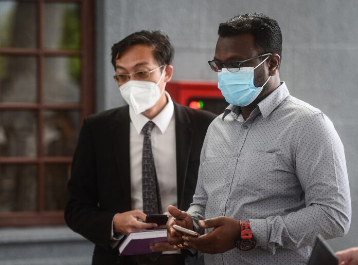 Malaysia-Singapore Workers Task Force chairman S. Dayalan (right) at the Sessions Court in Kuala Lumpur October 12, 2021. — Bernama pic