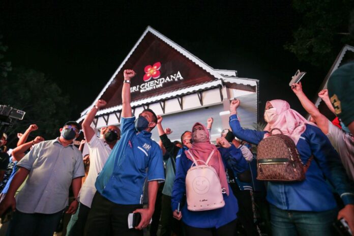 Barisan Nasional supporters celebrate a win for the coalition during the Melaka state election vote count at Dewan Seri Chendana, Ayer Keroh November 20, 2021. – Picture by Ahmad Zamzahuri