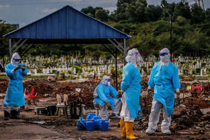 Health workers in personal protective equipment after burying the body of a Covid-19 victim at the Muslim cemetery in Section 21, Shah Alam July 10, 2021. – Picture by Hari Anggara