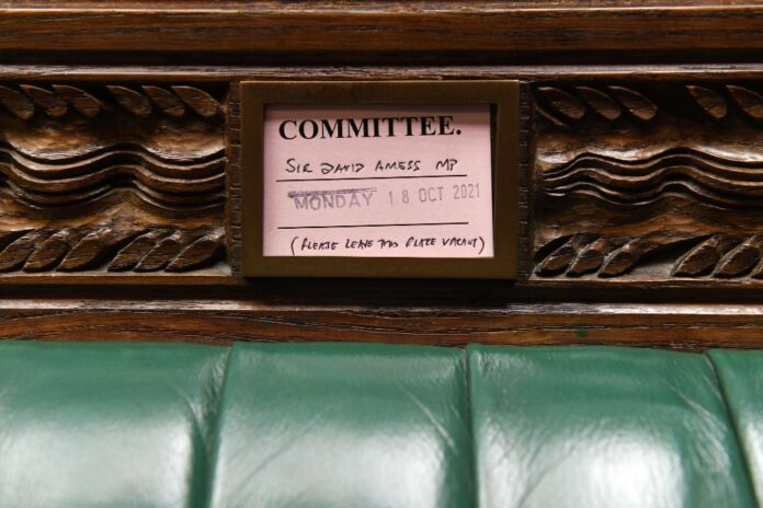 A handout photograph released by the UK Parliament shows a note above a seat, requesting it be left vacant, as members of parliament hearing tributes in memory of their killed colleague David Amess, at the House of Commons in London on October 18, 2021. — AFP / UK Parliament pic