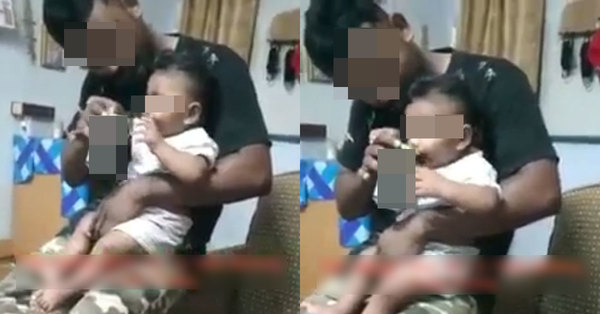 A video showing a man feeding a baby an alcoholic beverage while seating on the armrest of a sofa has gone viral on Facebook