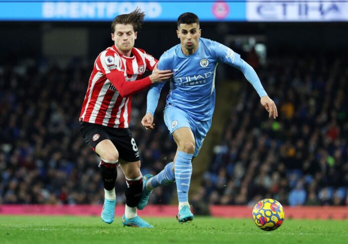 Manchester City’s Joao Cancelo in action with Brentford’s Mathias Jensen at the Etihad Stadium, Manchester February 9, 2022. — Reuters pic