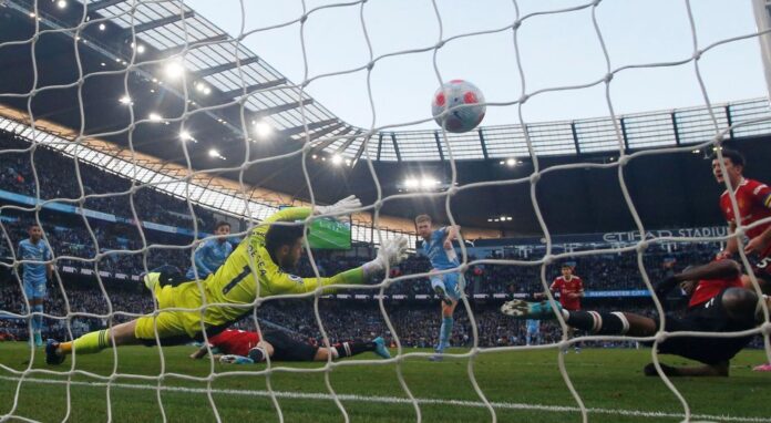 Manchester City’s Kevin De Bruyne scores their second goal past Manchester United’s David de Gea at the Etihad Stadium, Manchester March 6, 2022. — Reuters pic