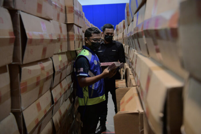 Police conduct checks on the smuggled cigarettes in Pontian, March 10, 2021. — Bernama pic