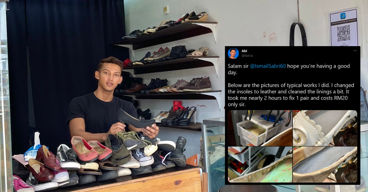 “Below are the pictures of the typical works that I do. I changed the insoles to leather and cleaned the linings a bit. It took me nearly 2 hours to fix 1 pair and costs RM20 only sir,” he tweeted.