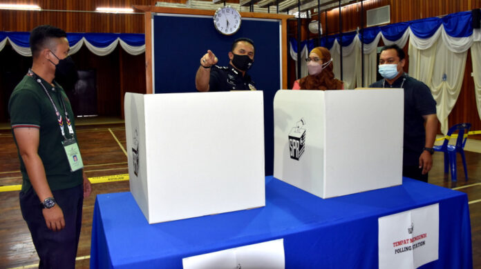 Melaka Deputy Police chief Datuk Razali Abu Samah (2nd left) oversees final preparations for early voting at the Melaka police contingent headquarters’ multipurpose hall, November 15, 2021. — Bernama pic