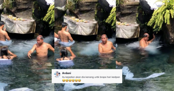 Namun, apa yang lebih menarik perhatian adalah apabila salah seorang pakcik dilihat sangat fokus dalam upacara melukat sehinggakan dia tidak perasan tualanya tertanggal.