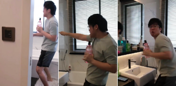 Captioned ‘My husband at “work”, until I can’t use the bathroom ;P’, the video starts off with the camera being taken through a walk-in closet, soon arriving at a glass door