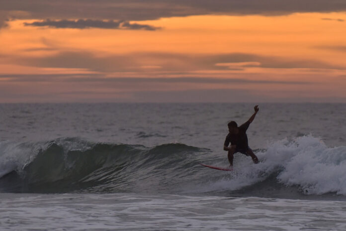 A surfer rides the waves at Karambunai beach in Sabah, February 28, 2022. MetMalaysia today said monsoon rains that have hit the country are expected to taper off and weather conditions are expected to improve from March 1-7. — Bernama pic