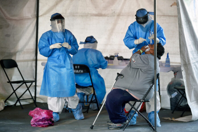 Health workers perform a Covid-19 rapid antigen test at a temporary health tent in Mexico City, February 12, 2021. — AFP pic