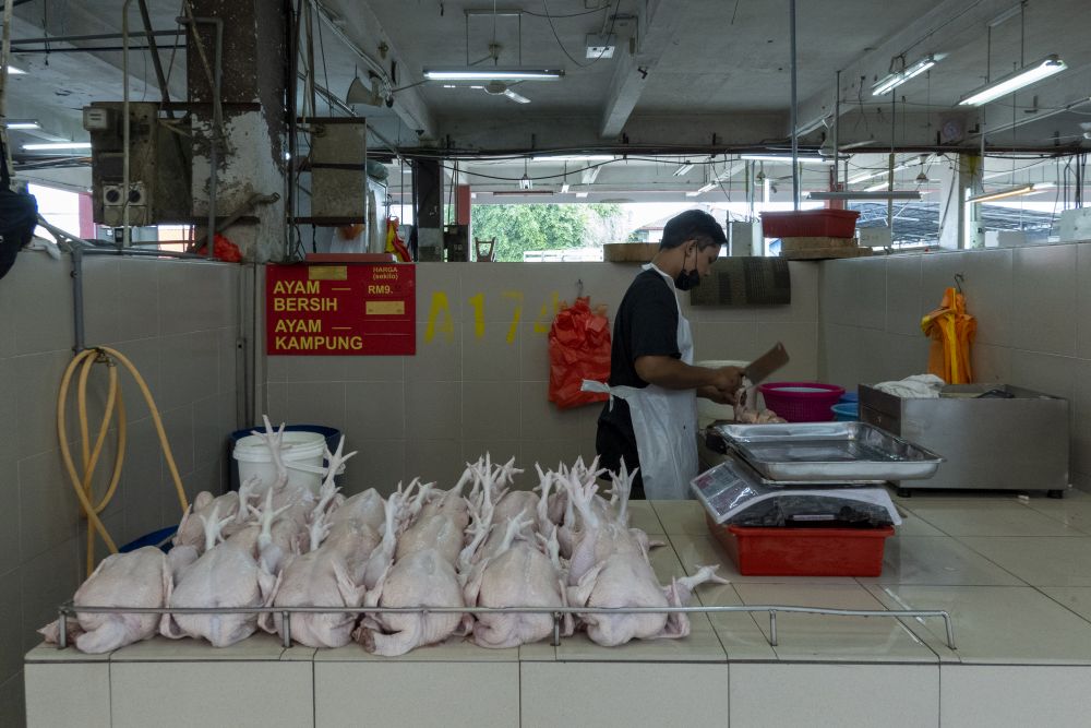 A chicken trader is pictured at the Petaling Jaya wet market April 20, 2021. — Picture by MIera Zulyana