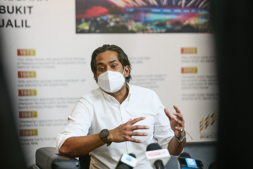 Minister of Science Technology and Innovation Khairy Jamaluddin speaks to the media at the Covid-19 vaccination centre in Bukit Jalil June 21, 2021. — Picture by Ahmad Zamzahuri