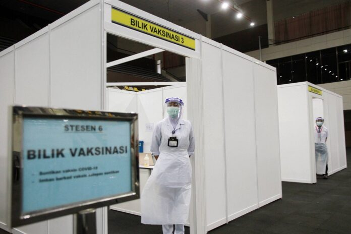 Health workers are seen at the Covid-19 vaccination centre located at the Indera Mulia Stadium in Ipoh February 23, 2021. — Bernama pic