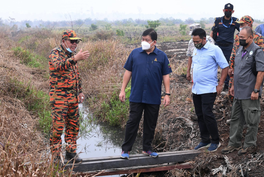 Selangor Tourism, Environment, Green Technology and Orang Asli Affairs Committee chairman Hee Loy Sian (second, left) monitoring the firefighting work in Kuala Langat Selatan Forest Reserve in Tanjung Sepat, March 2, 2021. — Bernama pic