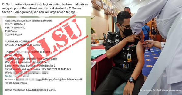 According to Sinar Harian, a Facebook post claimed that a policeman was taken to Gerik Hospital after receiving the second dose of the vaccine on Saturday, 3 April, and was later pronounced dead.