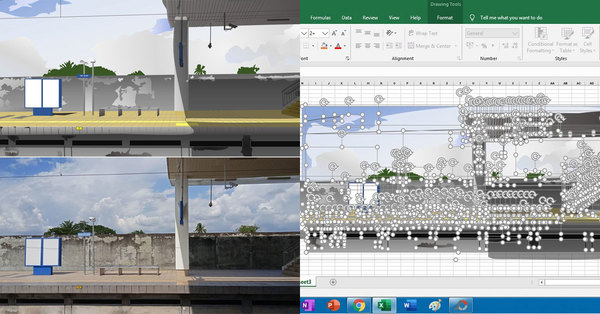 The comparison between Safarina’s Microsoft Excel artwork (top) and the real-life photo of the Tasek Gelugor KTM station.