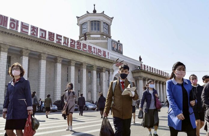 People wearing protective face masks walk in front of Pyongyang Station in Pyongyang, North Korea April 27, 2020, in this photo released by Kyodo. ― Kyodo via Reuters