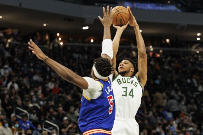 Milwaukee Bucks forward Giannis Antetokounmpo (34) shoots against Golden State Warriors forward Kevon Looney (5) during the third quarter at Fiserv Forum, Milwaukee January 13, 2022. — Reuters pic