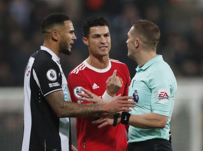 Manchester United’s Cristiano Ronaldo and Newcastle United’s Jamaal Lascelles with referee Craig Pawson at St James’ Park, Newcastle December 27, 2021. — Reuters pic
