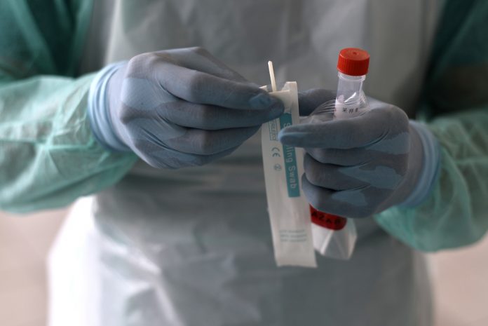 Selcare health officers take samples during a free screening of Covid-19 organised by the Selangor gtate government at Dewan Musa Muda, Shah Alam April 19, 2020. — Picture by Miera Zulyana