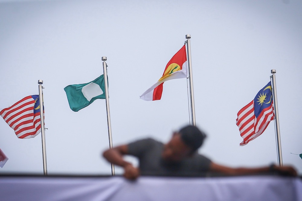 A man hangs Umno, PAS and Malaysia flags at the World Trade Centre Kuala Lumpur September 12, 2019. — Picture by Hari Anggara