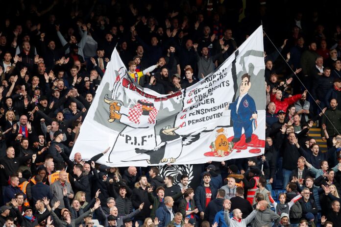 Crystal Palace fans with a banner in reference to the Newcastle takeover from a Saudi Arabia-led consortium, at Selhurst Park in London October 23, 2021. — Action Images via Reuters