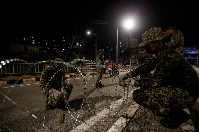 Armed Forces personnel cordon off the vicinity of Bayan Lepas with barbed wire June 4, 2021. — Picture by Sayuti Zainudin