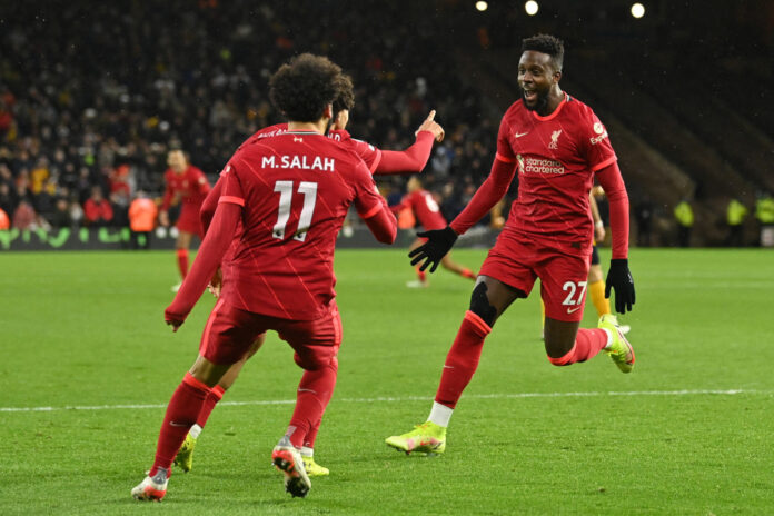 Liverpool striker Divock Origi celebrates after he scores his team’s opening goal during the EPL match between Wolverhampton Wanderers and Liverpool at the Molineux stadium in Wolverhampton, December 4, 2021. — AFP pic