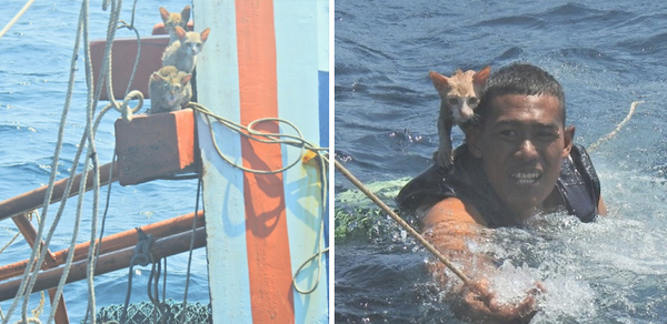 Oyen And 3 Other Cats Wait Patiently On Sinking Ship While Thai Navy Swims To Rescue Them