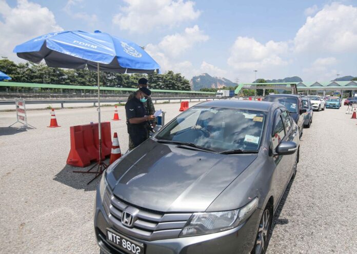 Police personnel conduct checks on vehicles at the Ipoh Selatan Toll May 10, 2021. — Picture by Farhan Najib