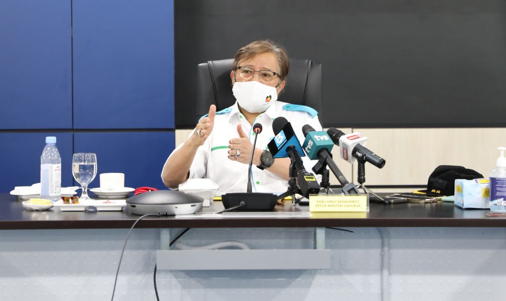 Sarawak Chief Minister Datuk Patinggi Abang Johari Openg speaks to reporters after launching the Sri Aman Development Authority (SADA) in Simanggang October 21, 2021. — Picture courtesy of the Sarawak Information Department