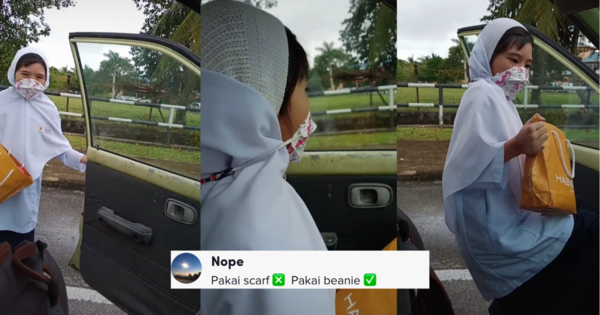 Namun, apa yang lebih menarik perhatian adalah apabila anaknya sampai, wanita tersebut terkejut melihat keadaan tudung anaknya itu yang hampir jatuh kebelakang.