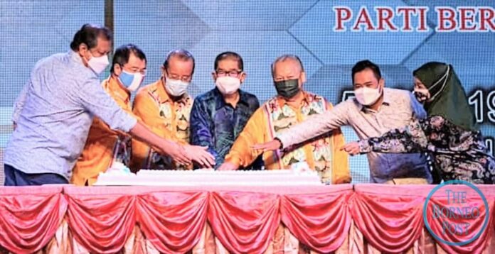 (from left) PBS secretary-general Datuk Joniston Bangkuai, deputy presidents Datuk Seri Panglima Yee Moh Chai, Datuk Seri Panglima Radin Malleh, Ongkili, PBS premier advisor Tan Sri Joseph Pairin Kitingan, youth chief Christopher Mandut and women chief Datin Malianah Ugau cut the party’s anniversary cake during the dinner last night. — Borneo Post pic