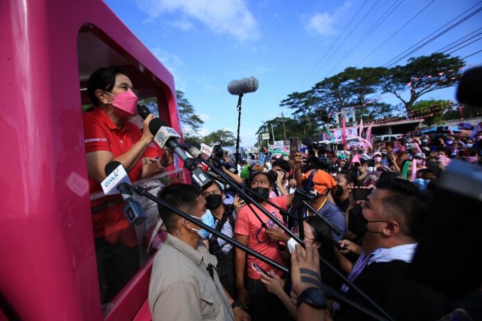 Philippine Vice President and opposition presidential candidate Leni Robredo (left) speaks from a truck during a campaign rally in the town of Libamanan, Camarines Sur province, south of Manila February 8, 2022. — AFP pic