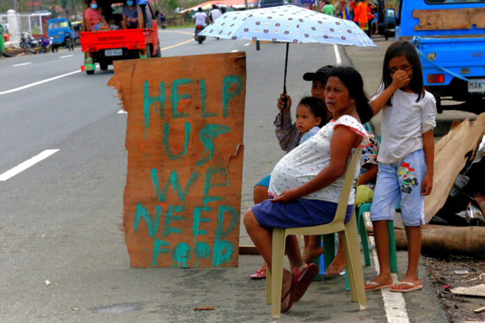 A family displays signage as they ask for alms along a highway in Surigao City, Surigao del Norte province on December 25, 2021, more than a week after Super Typhoon Rai devastated the province. — AFP pic