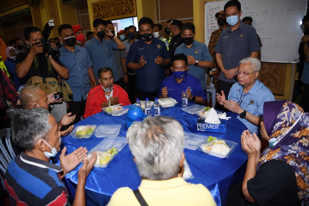 Prime Minister Datuk Seri Ismail Sabri Yaakob (right) has lunch with flood evacuees at the Dewan Besar D’Sury PPS in Jelebu December 21, 2021. — Bernama pic