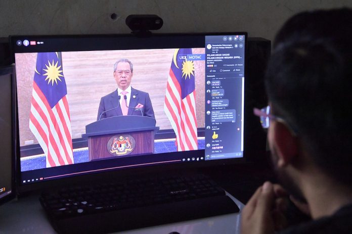 A viewer watches as Prime Minister Tan Sri Muhyiddin Yassin launches the National Tourism Policy 2020-2030 online. — Bernama pic