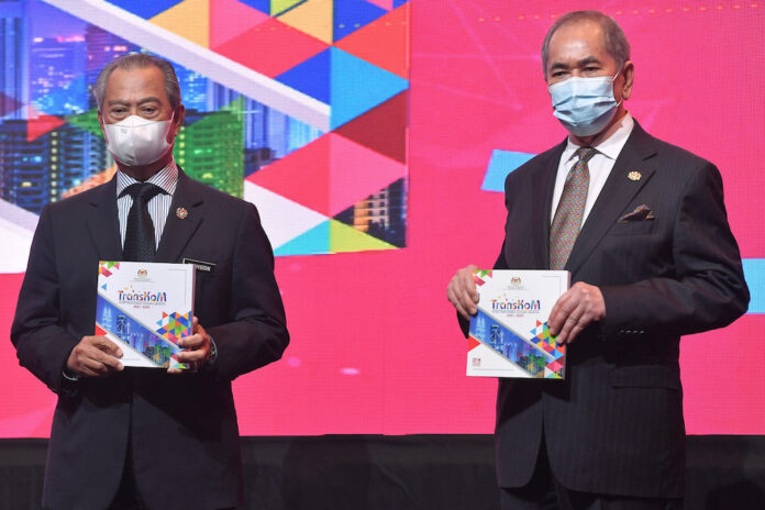 Prime Minister Tan Sri Muhyiddin Yassin and Minister for Entrepreneur Development and Cooperatives Datuk Seri Wan Junaidi Tuanku Jaafar posing with the Malaysian Cooperative Transformation Plan 2021-2025 (TransKoM) book that was launched today. — Bernama pic