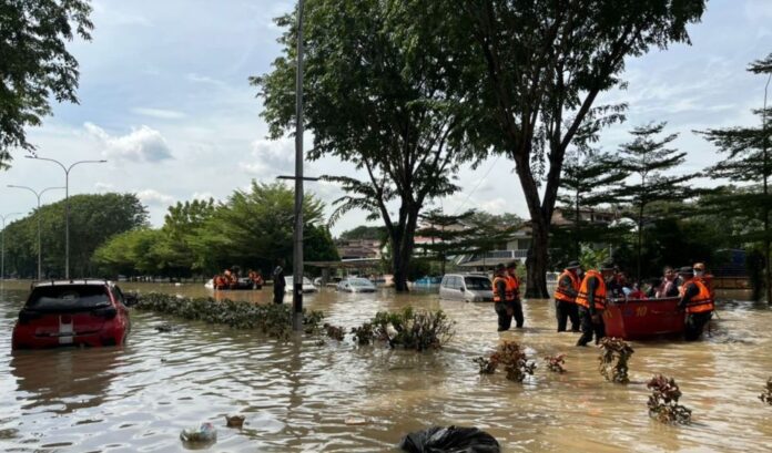 Search and rescue personnel evacuate flood victims in Taman Sri Muda, Shah Alam December 20, 2021. — Picture via Twitter