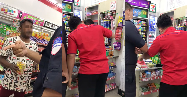 An auxiliary policeman and a man — in the recognisable red-coloured Prasarana uniform — are then seen roughing up and berating the man for the crime, with the latter purportedly slapping the victim twice in the back of the head.