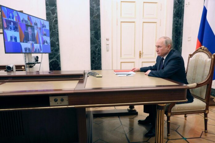 Russian President Vladimir Putin chairs a Security Council meeting via videolink in Moscow on March 11, 2022. — SPUTNIK / AFP pic