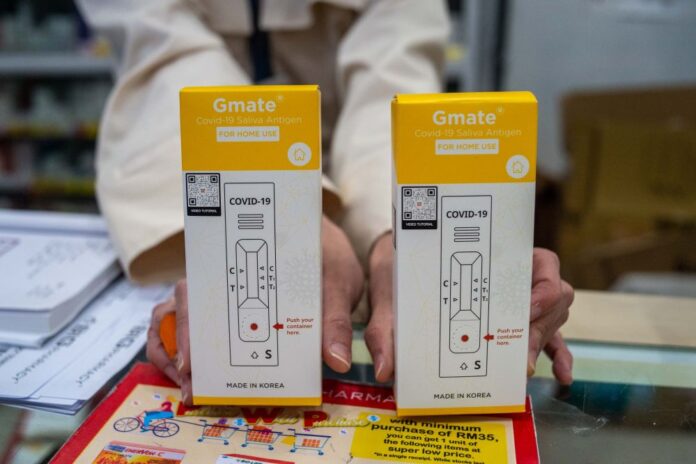 Gmate Covid-19 rapid antigen self-test kits are pictured at a pharmacy in Subang Jaya July 28, 2021. — Picture by Shafwan Zaidon