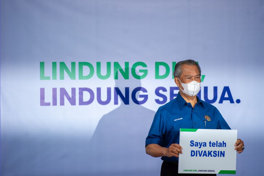 Prime Minister Tan Sri Muhyiddin Yassin poses for the cameras after receiving his jab during the launch of the National Covid-19 Immunisation programme in Putrajaya February 24, 2021. ― Picture by Shafwan Zaidon