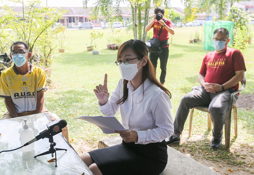Canning assemblyman Jenny Choy speaking to reporters at Laluan Perajurit 18 over the issue of water disruptions in Ipoh July 22, 2021. ― Picture by Farhan Najib