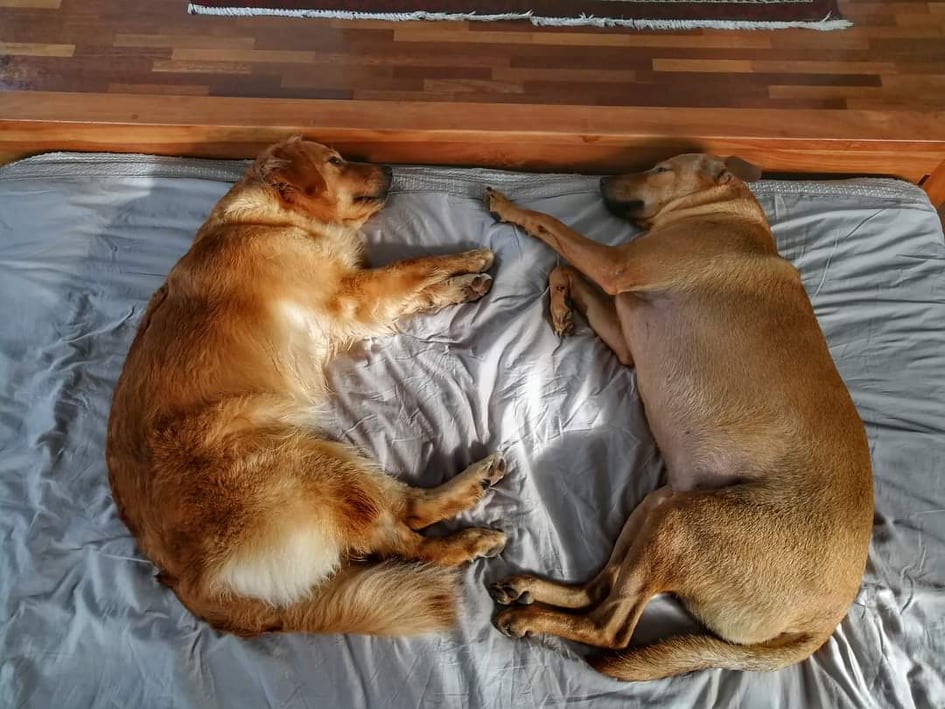 Like most dogs, sleeping on a warm and fluffy bed beside their favourite human is one of the best things in life, and Rolls and Bentley are no exception.