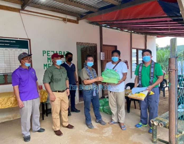 Dr Joachim (third left) hands over a food basket to a villager from Kampung Mansalu, which was one of the villages he visited last weekend.