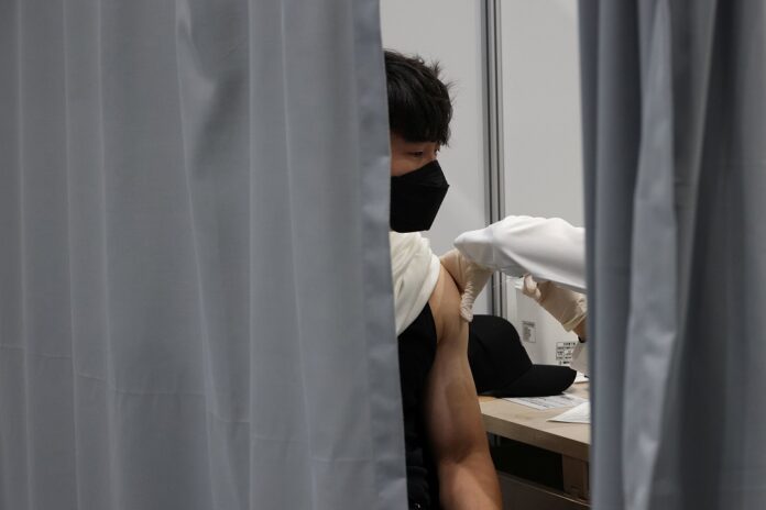 A man gets a dose of the Pfizer-BioNTech coronavirus disease vaccine at a Covid-19 vaccination centre on the last day of its operation in Seoul October 29, 2021. — Reuters pic