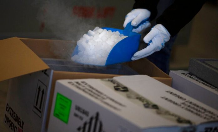 A difficulty with vaccine transport is that airplanes can only carry a limited amount of dry ice – frozen carbon dioxide – as it turns into gas over time, displacing the breathable air in the cabin.