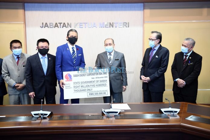 Sabah Energy Corporation Chairman Datuk Anuar Ayub (third left) presenting the replica cheque of RM8.5 million in dividend to Hajiji.