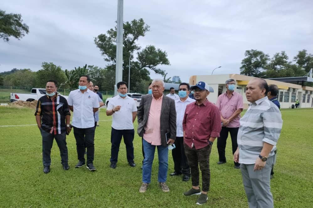 Bung Moktar (third right) taking a look at the condition of the training field beside Safa office in Likas today. Also seen are Jasnih (second right) and Benedict (third left).